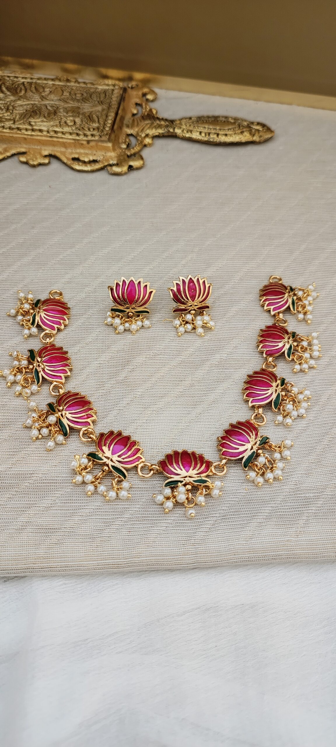 Be the first to review “Lotus Enamel Rani Pink With Green Necklace”